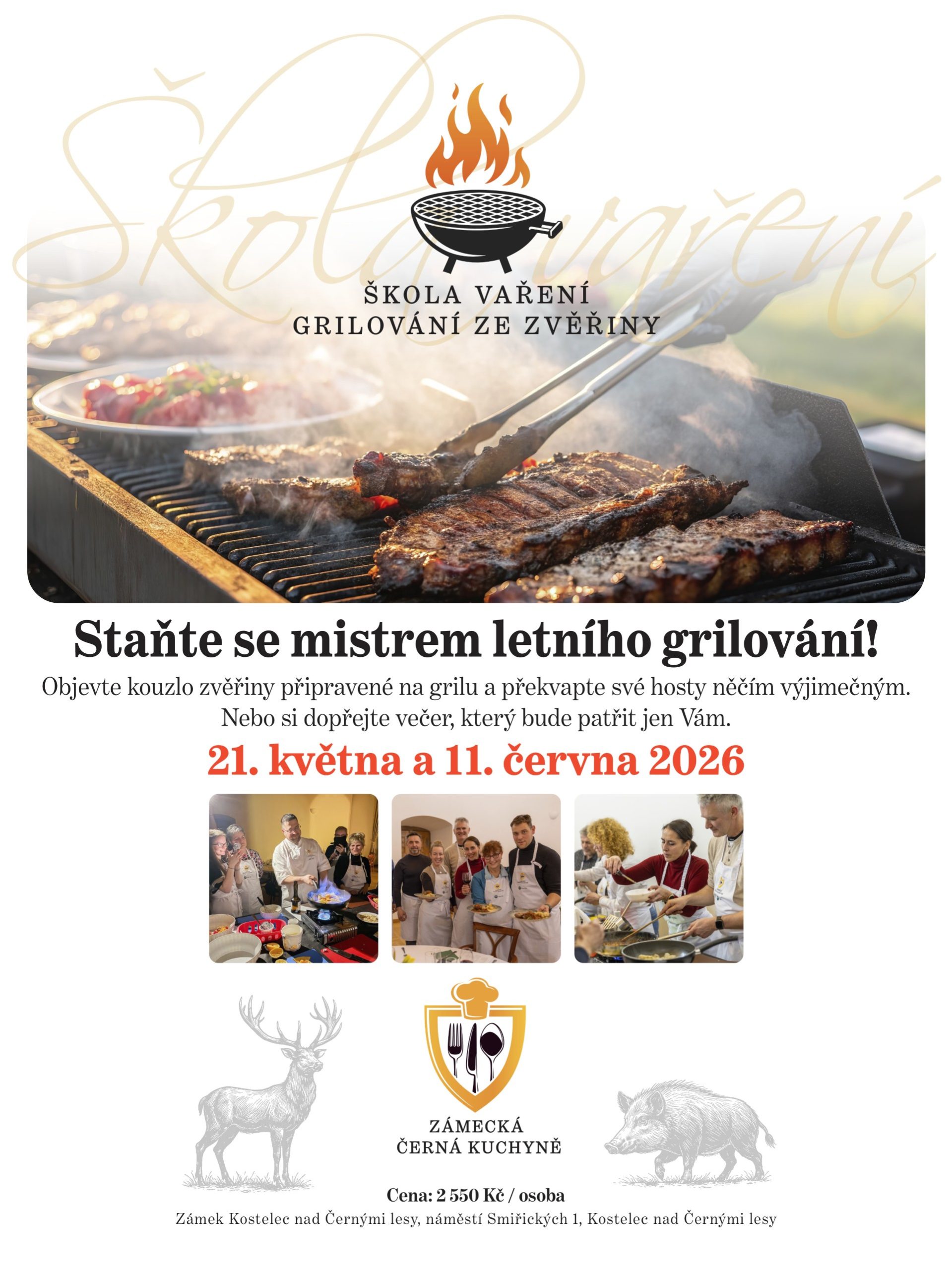 Čeká vás večer plný vůní, chutí a inspirace v prostředí zámecké černé kuchyně. Naučíte se pracovat se zvěřinou, správně ji připravit na grilu a odnesete si tipy, které využijete při každém letním grilování.