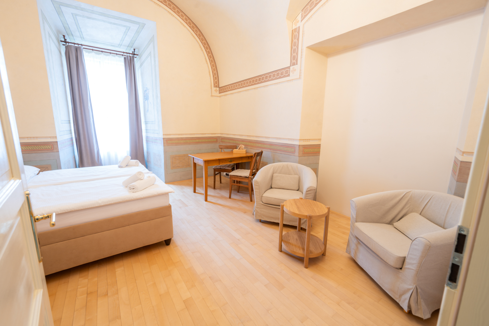 Pokoj má dvě standardní lůžka a je umístěn přímo v prostorách hlavní zámecké budovy. Zámek disponuje vlastní závodní kuchyní s bohatým výběrem teplých jídel, polévek a salátů. Denní menu je složeno z jedné polévky a tří teplých pokrmů za použití čerstvých a kvalitních potravin. Připravit lze i občerstvení pro slavnostní hostinu, raut i letní grilování na zámecké terase. Recepce funguje od 6:00 do 14:30, případně dle dohody.